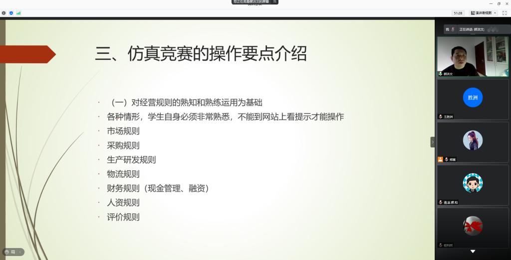 培训中,郝洪文老师以“是什么?怎么做?做成什么样?”为逻辑主线,依次就师生普遍关注的“什么是企业经营仿真竞赛”、“竞赛的操作要点”以及“模拟练习的目标”等问题进行细致讲解。郝老师特别强调,“大家要以战略思考为基础,以市场为发展线,以资本资源为约束线,以市场方案为原点,以研发、生产、采购、物流等运营体系为保障,形成经营比赛的思维要点与逻辑。”他建议参赛师生在赛前训练时可借助EXCEL或数学模型等工具来尝试打开企业经营决策的“黑箱”,以便更加科学的进行经营模拟。最后,王胜洲高度评价了郝洪文老师的精彩讲解,并对参赛人员提出明确要求,希望大家从认真研读竞赛规则开始,明晰思路、突出重点、稳扎稳打,为取得理想成绩做好充分准备。