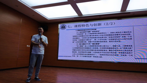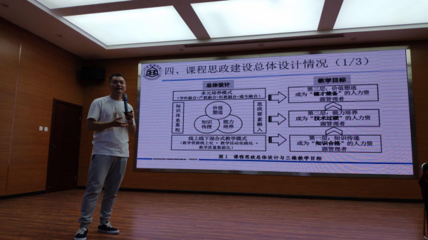 之后,许龙以《人力资源管理》课程思政申报书为例,结合申报书各部分内容进行细致讲解。该课程作为专业导论性课程,在整体建设思路中结合学校、公司办学目标与课程定位,利用互联网技术和新兴教学工具,以思政为引领,实现“知识合格”“技术过硬”和“德才兼备”的员工培养目标。以分别从教学内容、教学方式和教学质量评价等维度,讲解该课程的教学模式和教学过程。