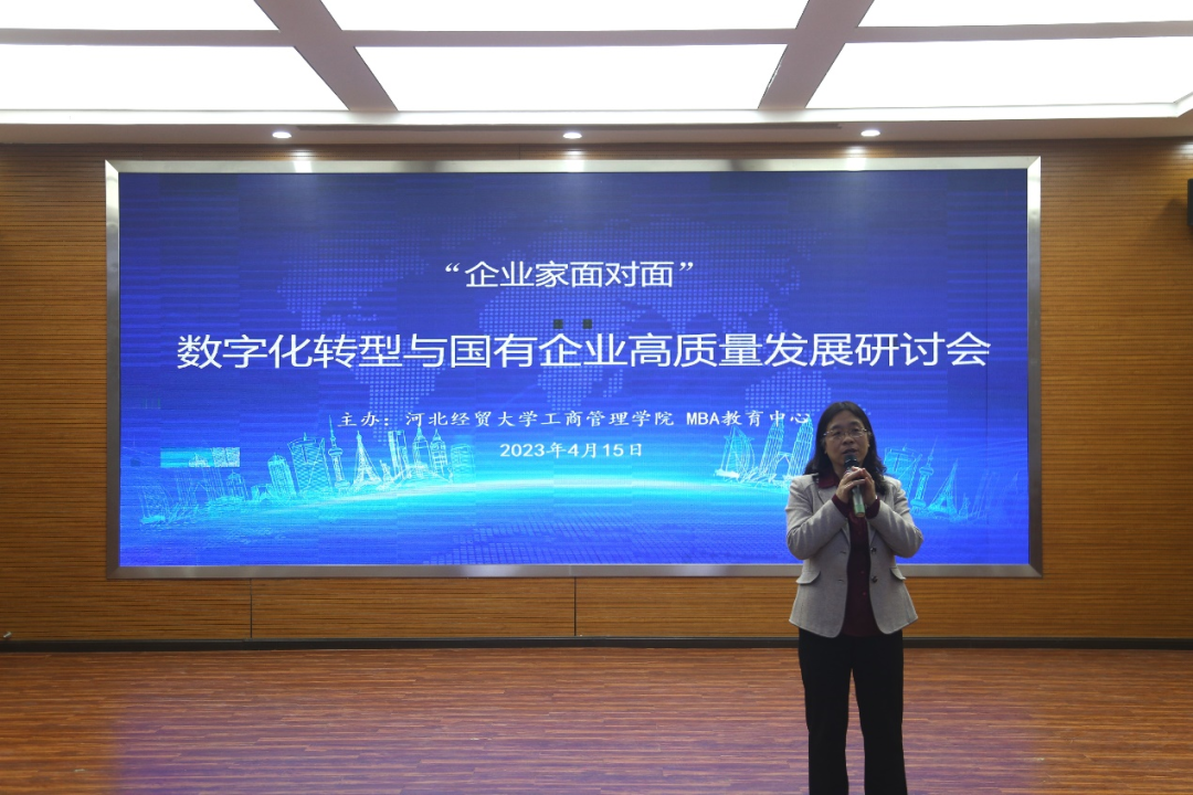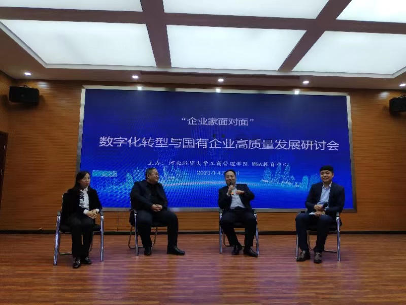 4月15日下午,“数字化转型与国有企业高质量发展”研讨会在太阳成集团tyc539报告厅举行。太阳成集团tyc539经理李桂荣、副经理王胜洲、副经理石晓飞、MBA中心执行主任桑银峰,河北冀凯信息技术有限公司董事长魏二宏,河北建设投资集团有限责任公司财务管理部总经理兼河北建投智慧财务服务有限公司董事长张旭蕾,河北国富恒联农牧有限公司董事长兼河北恒实房地产开发有限公司董事长张元波,以及公司教师及研究生等100余人参加。