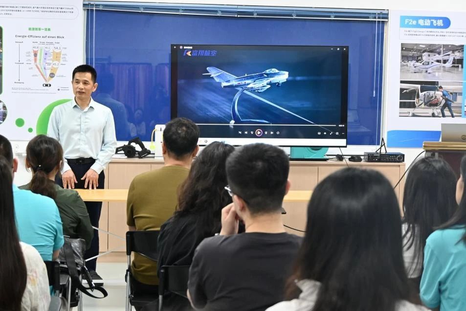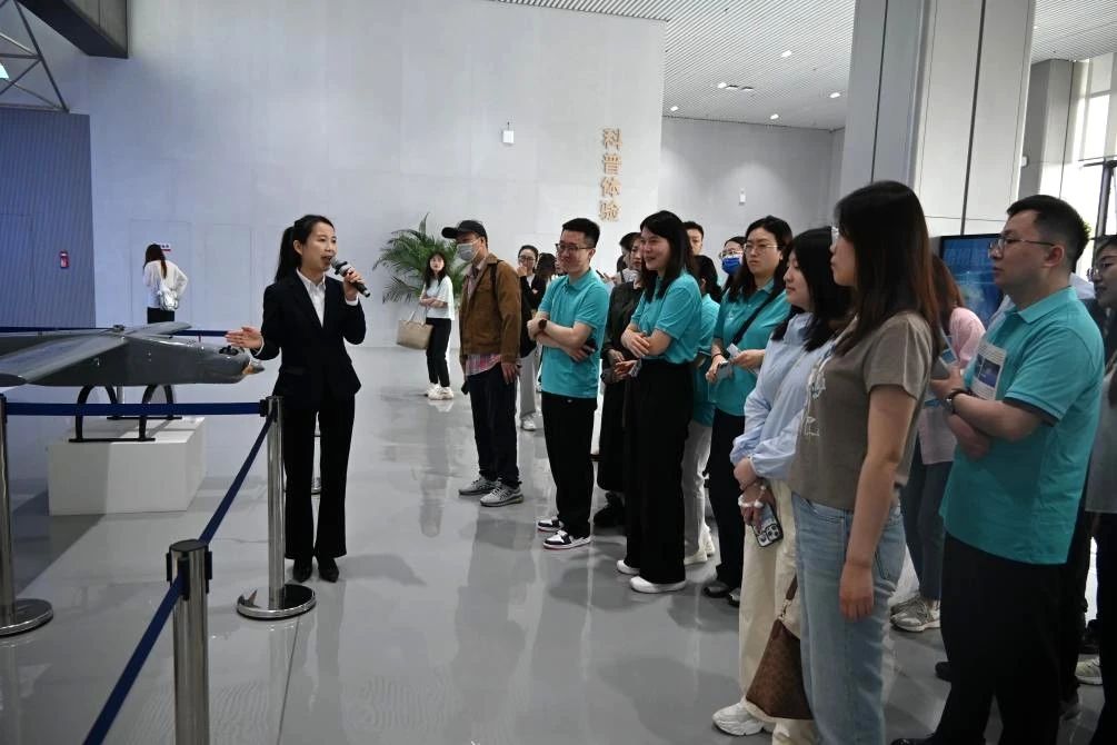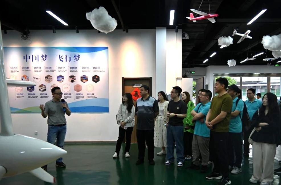在服务中心专业讲解员的引导下,员工们首先参观了低空经济产业综合展厅。通过动态沙盘,直观了解深圳宝安作为全国低空经济先行示范区的战略布局——从无人机物流配送网络、空中应急救援体系,到城市立体交通规划,一幅“天空之城”的智慧蓝图徐徐展开。展厅内陈列的工业级无人机、eVTOL(电动垂直起降飞行器)模型及智能航电系统,更让学员们对低空经济产业的发展现状和未来趋势有了更直观的认识。