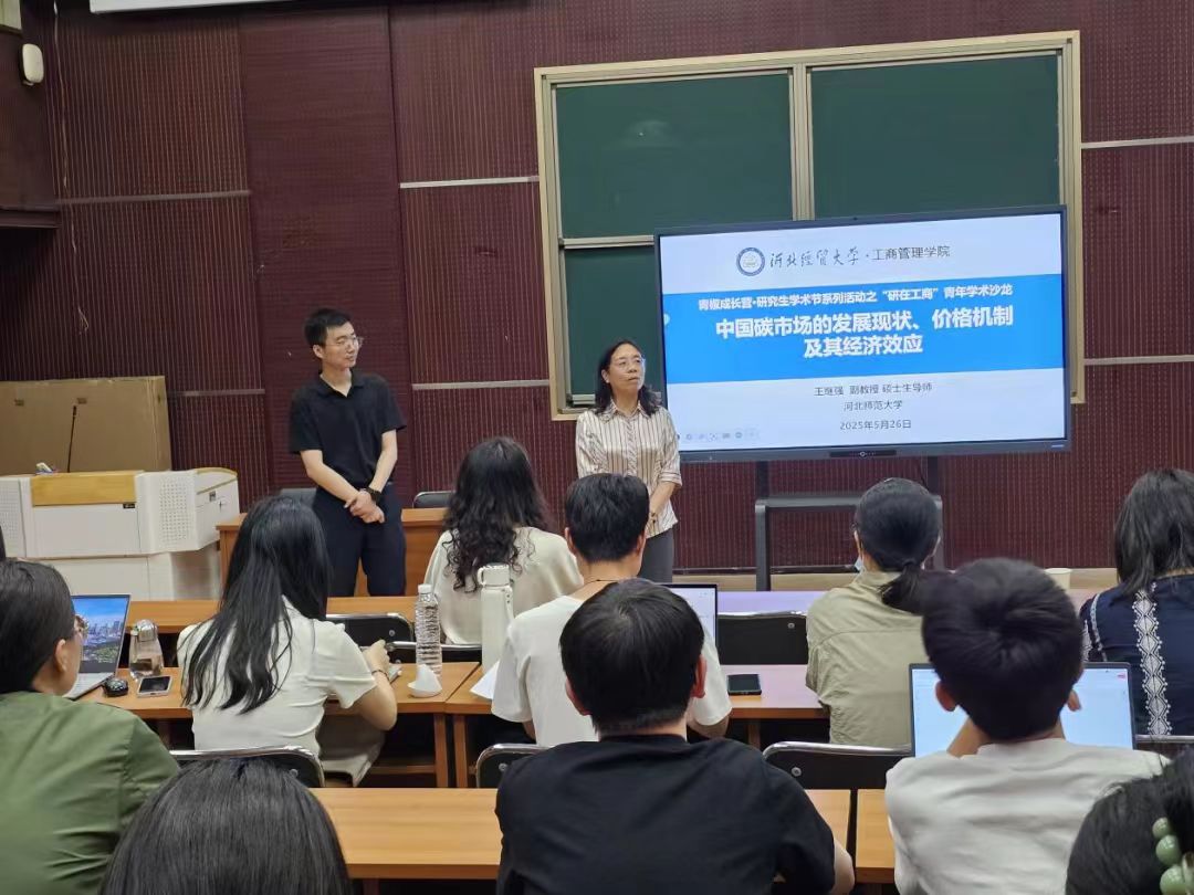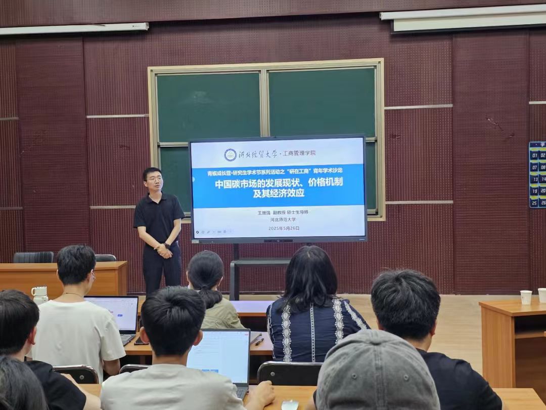 5月26日,青椒成长营·研究生学术节系列活动之“研在工商”科研学术讲座于MBA一教室举行,由河北师范大学商公司王继强副教授作题为“中国碳市场的发展现状、价格机制及其经济效应”的学术报告。会议由太阳成集团tyc539经理李桂荣教授主持,公司青年博士教师及全体学术型研究生参加。