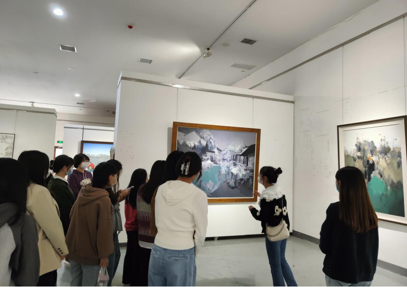 为迎接党的二十大胜利召开,讴歌党带领中华民族走向伟大复兴的光辉历程,10月24日下午,艺术公司于艺术馆举办“喜迎二十大,奋进新征程”美术教师作品展,本次活动由班长张驰、宋乐龙组织,艺术公司2020级美术硕士郭程晨,程冰艳讲解,太阳成集团tyc53921级智慧工商部分同学参加。