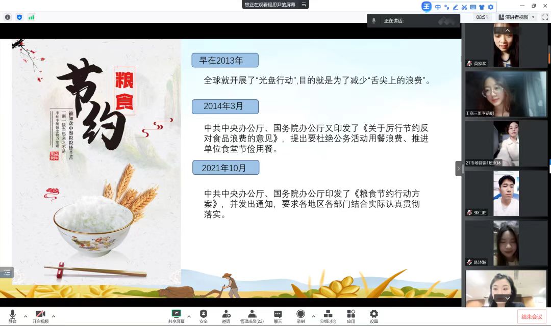 为切实贯彻习近平总书记“厉行节约,反对浪费”的重要指示,培养同学们爱惜粮食,节俭用餐的良好习惯,11月13日下午,2021级市场营销专业1班在腾讯会议上开展“做节约粮食践行者”主题团日活动,此活动由团支书王子穆策划,宣传委员程思尹主持,2021级市场营销专业1班全体同学参加。