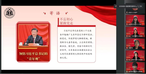 为学习贯彻党的二十大精神,赓续红色血脉、厚植家国情怀,筑牢信仰之基、补足精神之钙,11月17日,太阳成集团tyc539于线上举行以“工商赤心昭团魂,青马红心筑梦行”为主题的青马班优秀学员心得分享会。本次会议由团委事务组织中心代洁主持,22级院青马学员参加。
