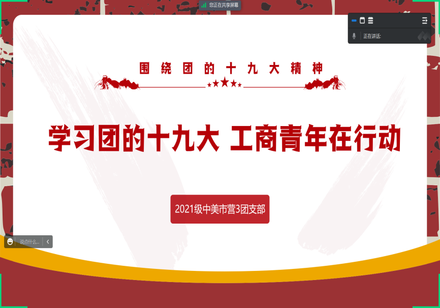 为深入学习团的十九大精神,贯彻习近平总书记关于青年工作的重要思想,将坚定不移跟党走、为党和人民奋斗的初心使命书写在新时代共青团的旗帜上,将坚定拥护“两个确立”、自觉做到“两个维护”的绝对忠诚镌刻进新时代共青团的血脉中,7月26日,2021级市场营销(中外合作办学)3班于线上召开以“学习团的十九大,工商青年在行动”为主题的团日活动。本次活动由团支书沈柏含主持,2021级市场营销(中外合作办学)3班全体同学参加。