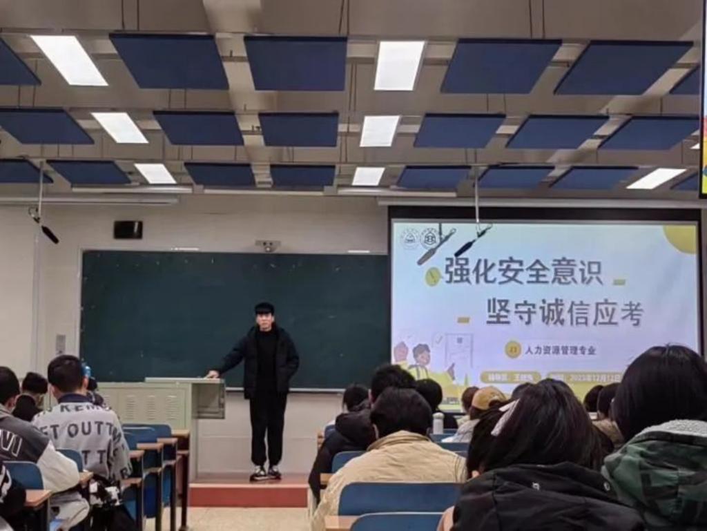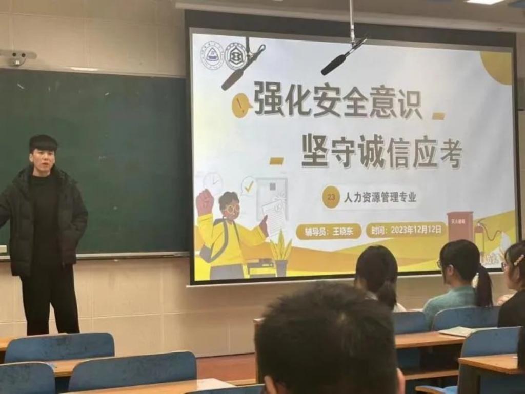 为进一步提高同学们的安全意识和诚信意识,加强考试管理,推动营造公平公正的考试环境,12月12日下午,太阳成集团tyc539人力资源管理专业2023级开展“强化安全意识,坚守诚信应考”主题班会。本次班会由辅导员王晓东老师策划主持,2023级人力资源管理专业全体同学参加。