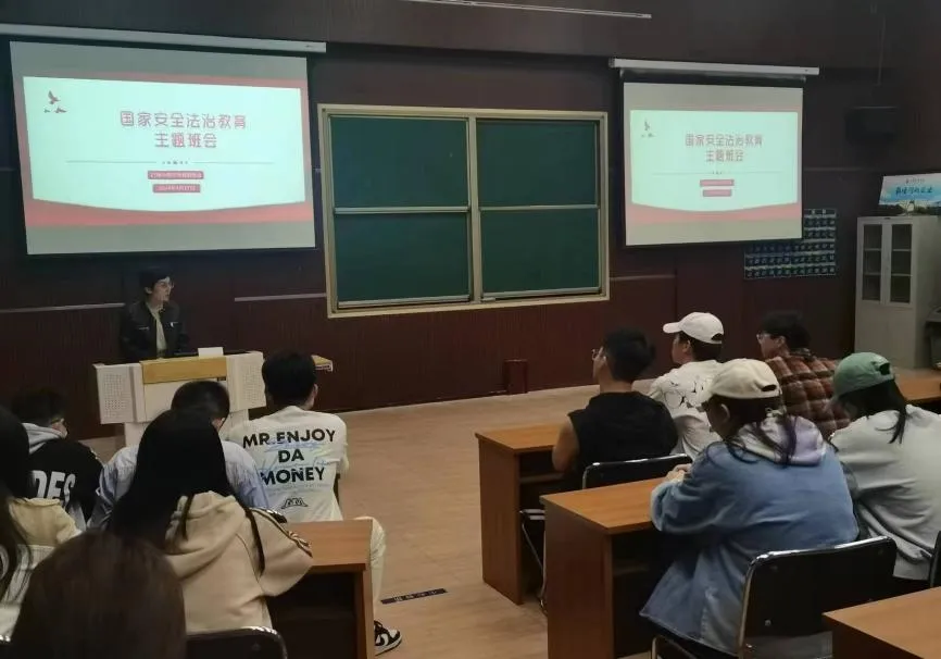 会议伊始,团支书张逸城介绍了有关国家安全的基本常识,强调国家安全是包括政治安全、国土安全、生态安全、文化安全、社会安全等“11种安全”在内的总体国家安全观。通过对《中华人民共和国宪法》中有关国家安全的规定的学习,同学们进一步增强了自身法治观念,深刻认识到身为中国公民所应履行的义务。紧接着,张逸城向同学们详细讲述了危害国家安全的行为,引导同学们树立正确的国家安全观和法治观。最后,李海燕老师对此次班会进行了总结,并呼吁大家身为新时代青年,应自觉抵制危害国家安全的行为,避免落入不法分子的陷阱,时刻维护祖国的安全、荣誉和利益。