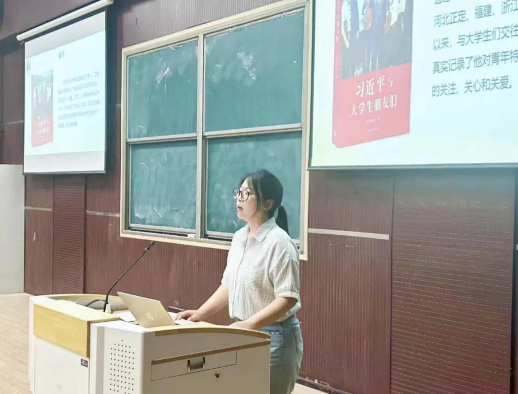 紧接着,程艺晗以“读经典,树新风”为主题,向同学们介绍了《习近平与老员工朋友们》一书。书中运用访谈的方式讲述了习近平总书记从地方到中央工作期间与不同老员工群体交往交流的故事。书中的故事鼓励同学们坚定理想信念,志存高远,脚踏实地,成为经得起考验、抓得住机遇的有志青年。她强调在学知识长本领的问题上,要下一番功夫,心无旁骛,克服浮躁之气,静下来多读经典,努力从会读书的人变成会创作的人,争做自主创新的“排头兵”。最后,同学们围绕在读红色书籍展开讨论,并通过小组代表发言的形式讲述自身对经典书籍的理解和感悟。