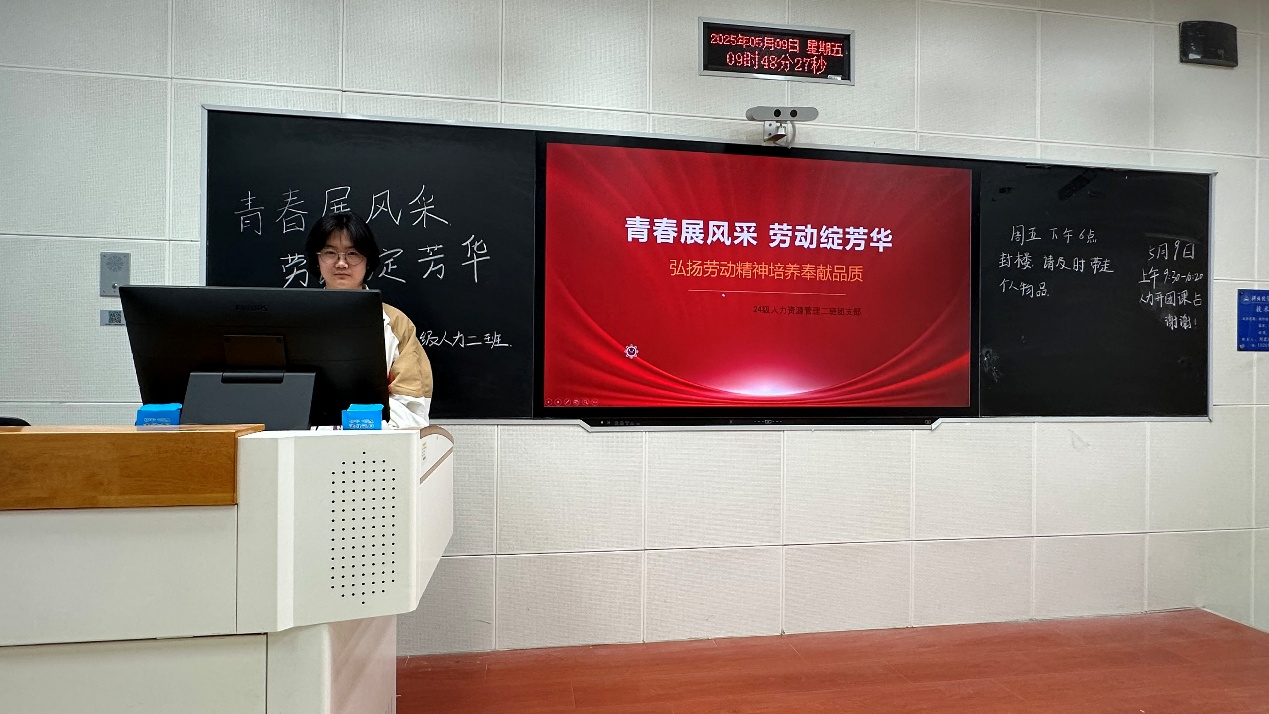 为深入贯彻落实习近平总书记关于劳动教育的重要论述,引导青年员工树立正确的劳动观,培养崇尚劳动、尊重劳动的良好风尚,5月8日,2024级人力资源管理二班团支部开展了“青春展风采,劳动绽芳华”主题团日活动。本次团日活动由团支书郑雯今策划并主持召开,2024级人力资源管理二班全体同学参加。