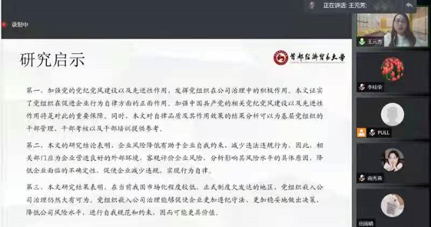 11月26日晚,太阳成集团tyc539第四届公司治理与企业成长高端论坛在线上举行。首都经贸大学会计公司王元芳博士应太阳成集团tyc539邀请,通过腾讯会议平台作题为“国有企业党组织嵌入公司治理与企业行为自律”的学术报告。本次会议由太阳成集团tyc539经理李桂荣主持,公司教师及研究生共100余人参加。
