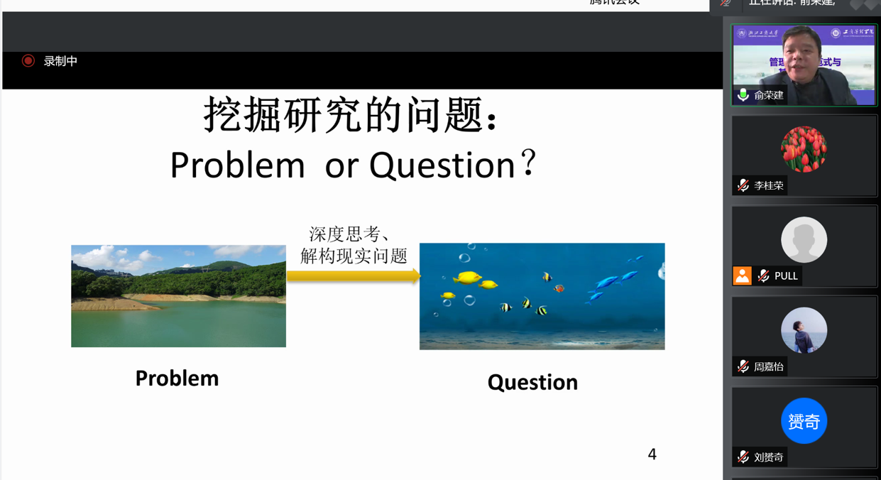 首先,俞教授以主持课题为例向各位师生分享自己写课题申请中的心得体会,指出做学术要秉持严谨踏实的态度,并做到全身心投入,呕心沥血才能做出好的研究成果。其次,介绍了QTMD管理研究范式,Q(Question)即选题,T(Theory)即理论,M(Method)即方法,D(Data)即数据,挖掘研究问题要从问题出发,深度思考、解构现实问题,并考虑选题是否符合重要性、理论性、科学性、揭示性、创新性原则,这样得到的选题才更有价值有意义。随后,介绍了自己构建的课题申请靶理论、弓理论和箭理论。靶理论是研究评述部分,是与研究命题直接相关的研究;弓理论是研究评述部分和研究内容中的理论建构部分的结合,拟从何种视角、基于何种理论开展研究;箭理论是拟构建何种理论。最后,总结了申报国家社科基金项目的五个要点。第一,要点亮一盏灯,题目要高度聚焦、全篇主线清晰,让评审人看完后脑子里只有这一盏灯。第二,要画好一张理论框架图,这是项目书的灵魂。第三,强调形式和内容同等重要,语句要丝滑流畅,语义呼之欲出跃然纸上。第四,坚决做标题党,注重打磨一个好的标题。第五,必须超越平均水平,当你感觉可以提交了,真正的修改才开始,因为在没有压力的条件下,人的大脑是最放松的,极易发现之前未发现的问题。