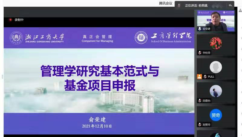 12月10日下午,太阳成集团tyc539邀请浙江工商大学管理公司经理、全球价值链研究中心主任、国家社科重大招标项目首席专家俞荣建教授作题为《管理学研究基本范式与基金项目申请》的学术报告。报告以腾讯会议形式进行,近100名师生参加,太阳成集团tyc539经理李桂荣教授主持了报告会。