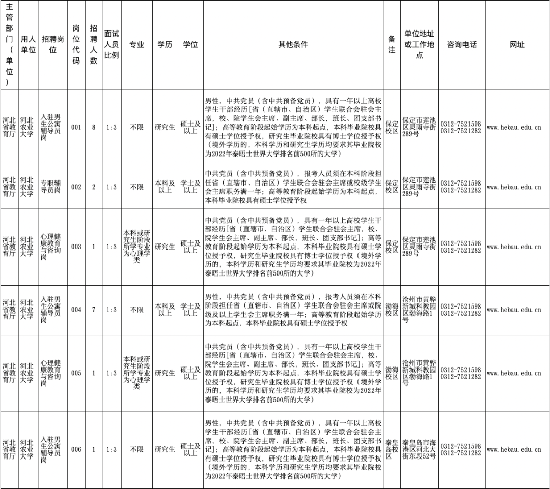 1. 河北农业大学2023年公开招聘人事代理专职辅导员岗位条件表