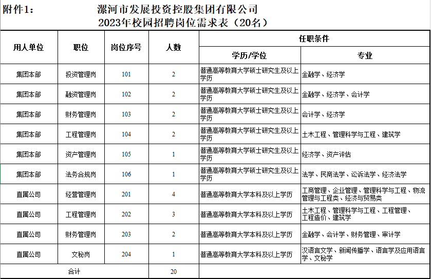 招聘计划详见附件1:《漯河市发展投资控股集团有限公司2023年校园招聘岗位需求表》