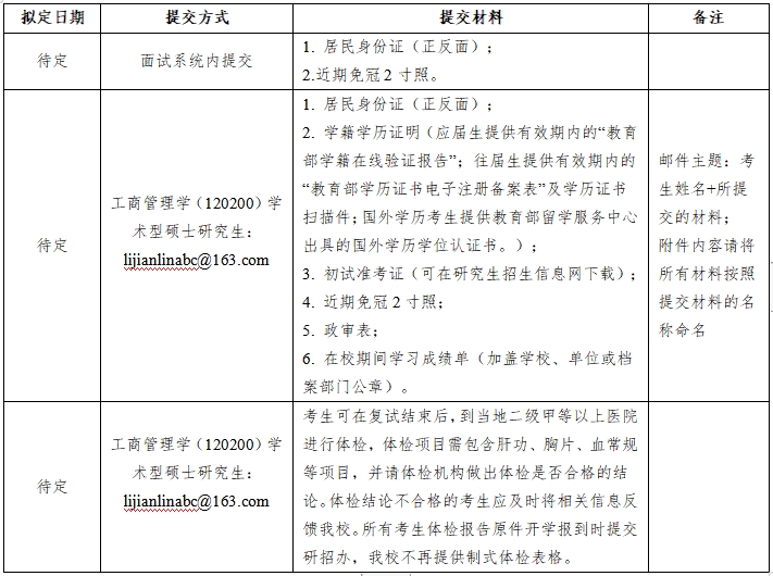 所有考生在复试结束后须随时关注“中国研究生招生信息网”的相关提示,且保持预留的联系方式畅通。列入拟录取名单的调剂考生在规定时间内点击确认“待录取”,才能被确定“拟录取”资格。已被其他学校“待录取”的考生视为自愿放弃,不予录取。因考生个人原因未能接收信息或电话提醒,导致影响录取结果的,责任由考生本人承担。所有拟录取的调剂考生确认接受学校“待录取”通知后,将视为同意遵守学校复试录取规定,学校不再受理考生提出的解锁申请。