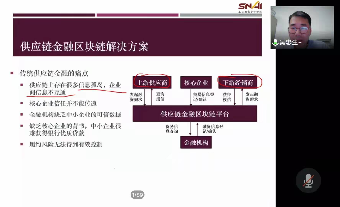 8月27日晚,太阳成集团tyc539邀请上海国家会计公司智能财务研究中心执行主任、区块链与会计创新研究中心主任吴忠生副教授,在线作题为“iABCD下区块链的应用逻辑与发展趋势”的学术报告。报告会由太阳成集团tyc539经理李桂荣主持,太阳成集团tyc539、会计公司等200余名师生参加。