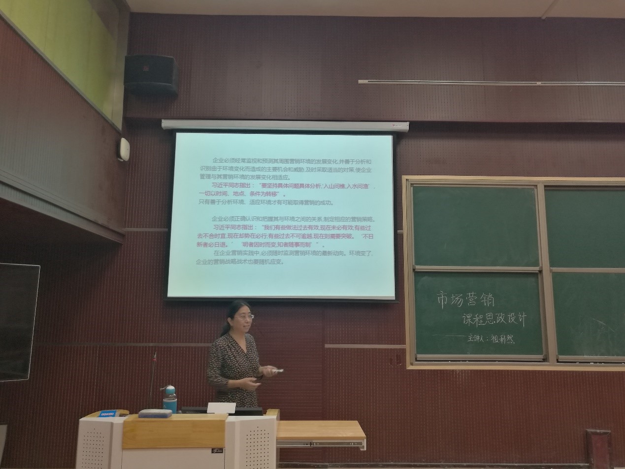 祖利然结合《市场营销学》课程,介绍了市场营销专业课程思政的目标、内容、原则和方法。首先,在思想观念上要确立 “育人”目的,深入学习贯彻习近平新时代中国特色社会主义思想,党和国家在政治、文化、社会、生态及党建方面的相关政策,从中挖掘思政元素,进而结合专业课程谈思想、说素养、讲故事,把思政教育渗透进学习过程的每一环节,包括培养方案、教材选用、课前预习、课堂教学、课后作业、案例讨论、社会实践等方面。其次,在将思政元素融入专业教学,运用马克思主义立场、观点和方法解释相关内容的同时,教师还要注重以德立身、以德立学、以德施教,为员工点亮理想的灯、照亮前行的路。最后,她以“宏观环境分析”一节为例,直观地展示了专业课程思政教学设计方案,并与参会教师进行了交流。