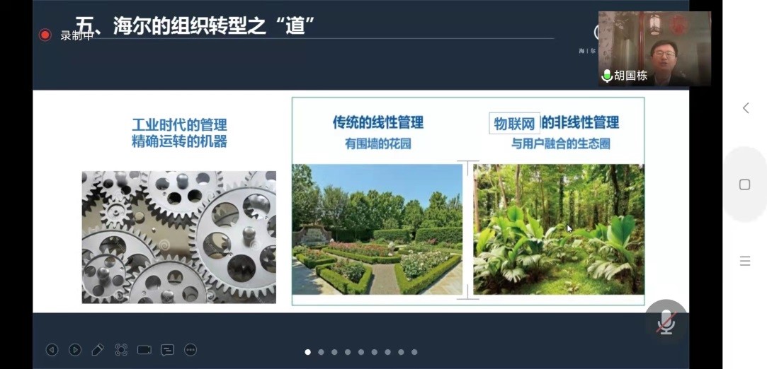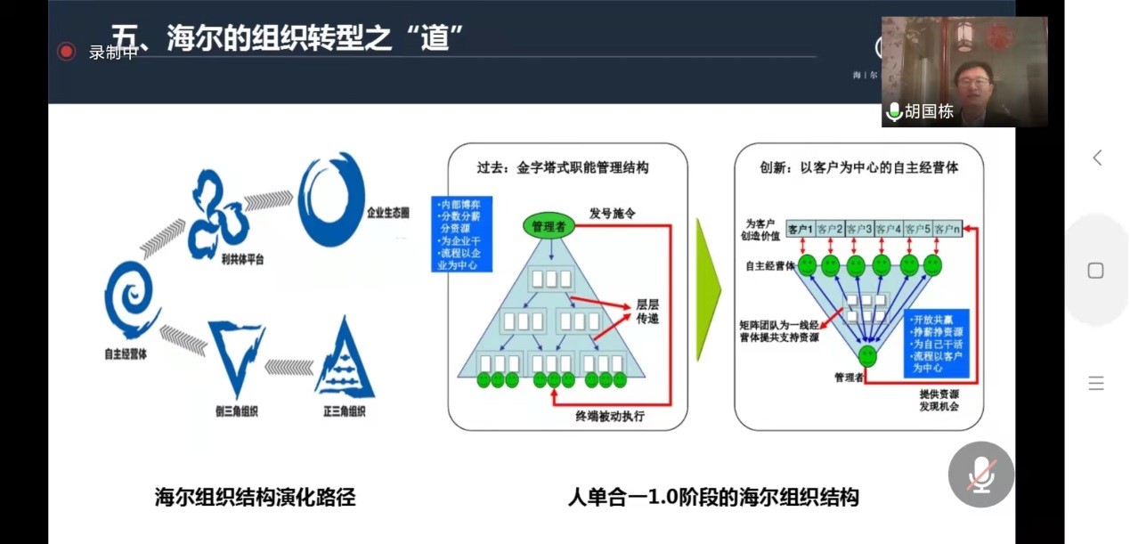 胡国栋教授从走进海尔、物联网时代的挑战、海尔的文化基因与企业转型、人单合一:创建世界级的物联网模式、DAO:海尔的组织转型之“道”、海尔制:第三次企业管理革命、探索与迎接新的管理时代这七个方面对海尔制进行了讲解。首先,指出海尔是一家物联网生态企业,介绍了海尔的组织模式和其当前对海尔制的学术研究。随后,从物联网时代的管理挑战、海尔的文化基因与企业转型、人单合一:创建世界级的物联网模式、DAO:海尔组织的转型之“道”、海尔制:第三次企业管理革命五个方面进行了详细的讲解,指出未来商业模式的创新更多在于通过对资源的重新界定,采用颠覆性的交易结构和新颖的组织形式,以达成超越组织个体利润,以社会财富和可持续发展为衡量标准的价值创造目标。最后,指出管理没有终级的答案,只有永恒的探索,我们需要通过积极的探索实现从量变到质变的飞跃,从而引发管理的变革。