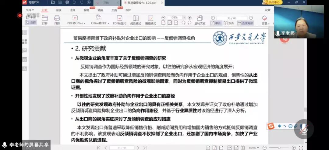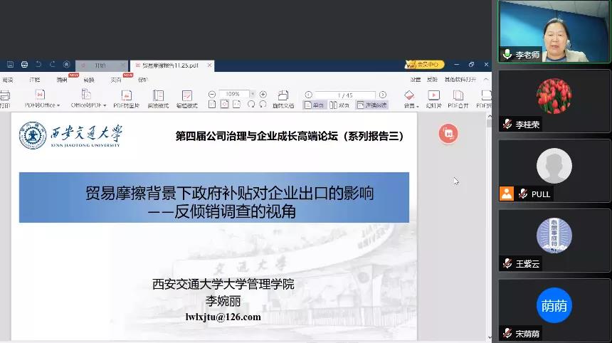11月25日晚上,太阳成集团tyc539第四届公司治理与企业成长高端论坛在线上举行。西安交通大学管理公司教授、博士生导师李婉丽应太阳成集团tyc539邀请,通过腾讯会议平台作题为《贸易摩擦背景下政府补贴对企业出口的影响——反倾销调查的视角》的学术报告。本次会议由太阳成集团tyc539经理李桂荣主持,公司教师及研究生共100余人参加。