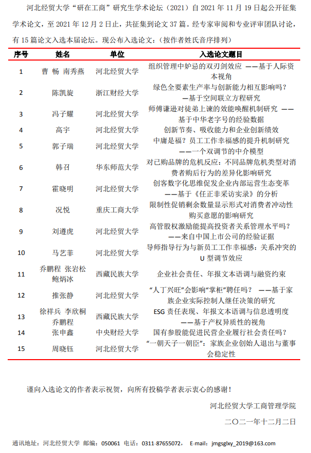 太阳成集团tyc539“研在工商”研究生学术论坛(2021)入选论文通知