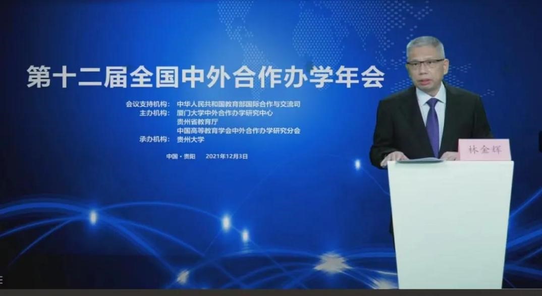 上午大会进行开幕式、专题报告、主旨报告环节。开幕式上,教育部国际司副司长陶洪建、教育部国际司办学处处长毛冬敏分别发表讲话,作中外合作办学政策解读和指导。教育部留学服务中心副主任杨凌介绍了留学服务中心开展的中外合作办学相关业务和创新举措。大会主席林金辉在大会上作了题为《中外合作办学高质量发展的基本内涵与政策透视》的主旨报告。他对年会主题“世界大变局下的中外合作办学:以高质量发展助推新发展格局构建”及下设的10个分主题作了说明,指出确定这样的主题和分专题,是在教育部国际司直接指导下完成的,是在对日新月异的、活生生的、火热的中外合作办学实践开展深入调研过中完成的。