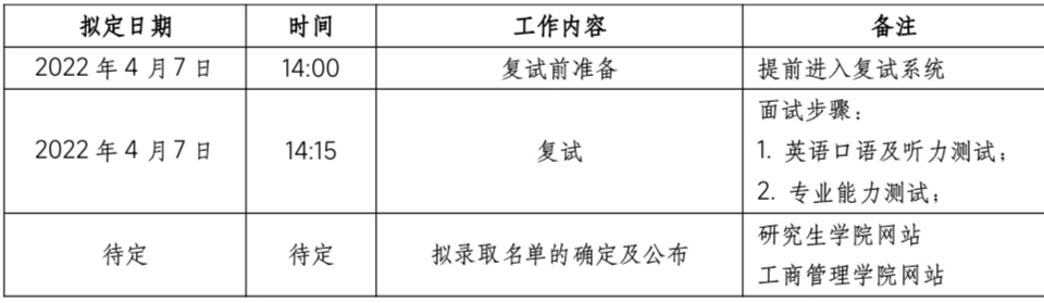 公司对未招满工商管理学术型硕士研究生名额现启动调剂程序,复试平台及操作请参照研究生公司公布的《复试须知》(https://yjs.hueb.edu.cn/info/1016/2310.htm),对调剂生将按1:2进行复试、择优录取。