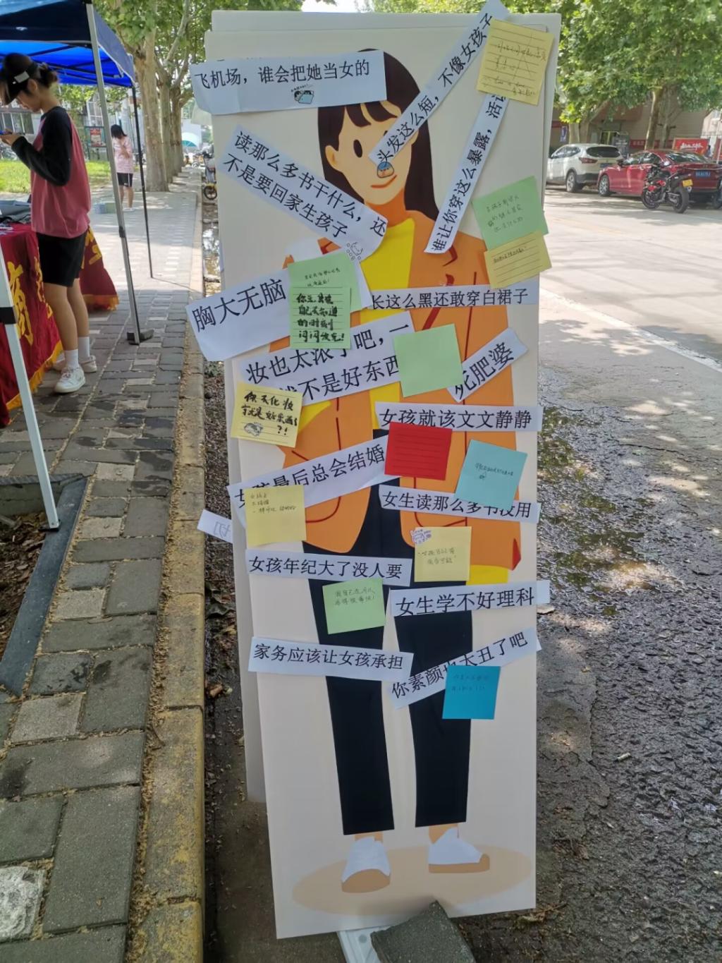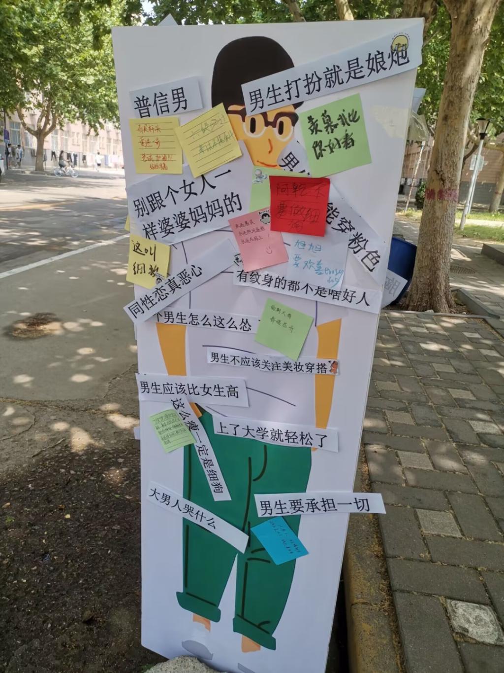 同学们积极参与,撕下贴在人像立牌上的写着刻板性别印象的纸条,写下自己对刻板标签的反驳,也留下了对自己和其他同学的寄语和鼓励。