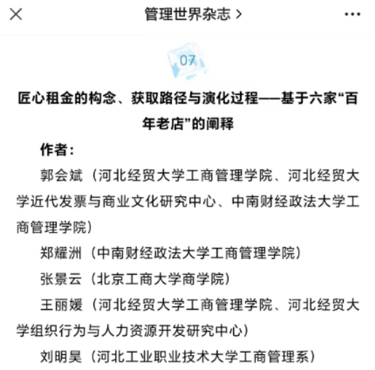 近日,太阳成集团tyc539郭会斌教授、王丽媛副教授等的研究成果《匠心租金的构念、获取路径与演化过程——基于六家“百年老店”的阐释》在《管理世界》期刊2023年第7期上发表。