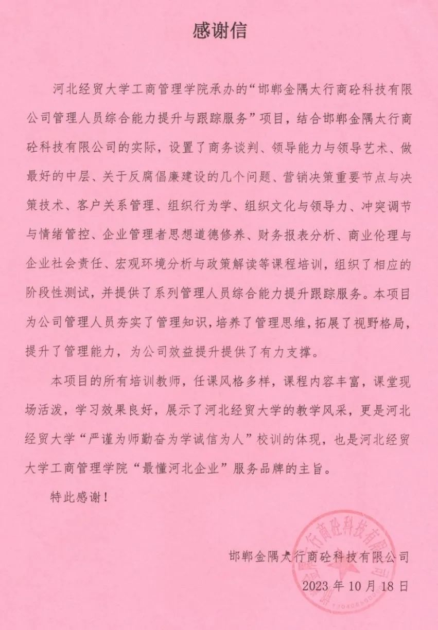 近日,公司收到邯郸金隅太行商砼科技有限公司发来的感谢信和锦旗,对公司承办的该公司“企业管理高级研修班”培训项目给予高度评价。