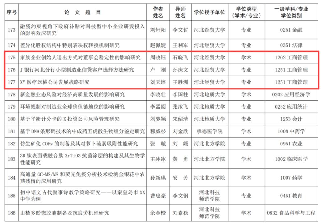 公司2022届毕业生周晓钰(导师:石晓飞)的学位论文《家族企业创始人退出方式对董事会稳定性的影响研究》;卢刚(导师:孙庆文)的学位论文《J银行河北分行小型制造业信贷客户选择方法研究》;刘天培(导师:王胜洲)的学位论文《XY医疗器械公司发展战略研究》分别荣获2021-2022学年度河北省优秀硕士学位论文。