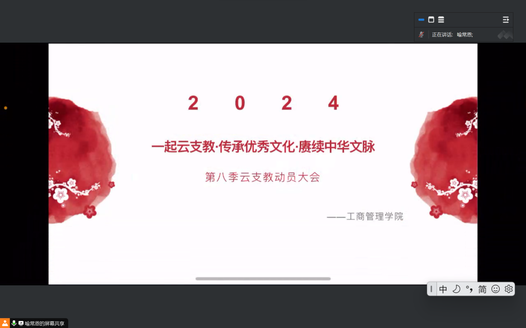 会议伊始,喻常恩对本次云支教活动的目的和意义进行了简单的介绍。随后,他分别从“运动青春展风采”“趣味阅读伴成长”“遇云课堂创未来”“享云研学传温暖”“经贸特色活动与‘乡村振兴’交流会”“宣传节奏”六个方面详细介绍了本次活动的主要内容,展示了活动材料提交流程。最后,他简单介绍了往期支教活动的开展情况以及经验,重点讲解了活动制度及注意事项,并对支持本次活动的领导老师和志愿者们表示了感谢。