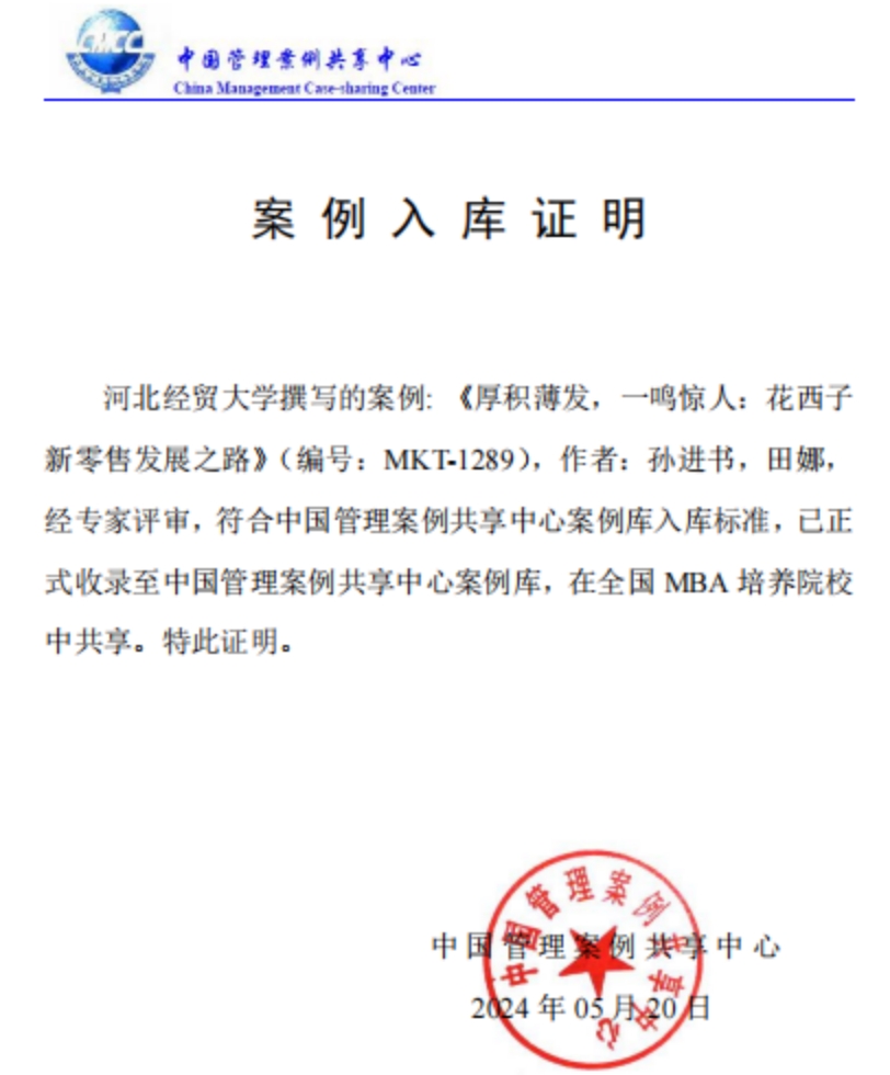 近日,太阳成集团tyc539讲师孙进书博士、2020级智慧工商管理2班田娜共同撰写的教学案例《厚积薄发,一鸣惊人:花西子新零售发展之路》入选中国管理案例共享中心案例库(编号:MKT-1289)。