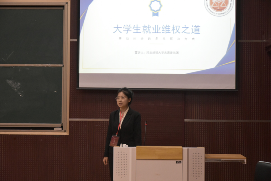 高锦煊以“老员工就业维权之道,劳动纠纷的多元解决方式”为主题,围绕选题的背景与意义、老员工就业陷阱、劳动者的维权路、劳动仲裁案例分析等四个方面展开讲解。她结合实习不算试用期、“三亏协议”不能代替劳动合同、工资拖欠可索赔等三个案例,为同学们展现在就业过程中可能出现的各类侵权现象,鼓励同学们多学习《中华人民共和国劳动法》,明确劳动者的权利和义务,用法律的知识武装自己,维护自己的合法利益,做法律的忠实拥护者和坚定捍卫者。