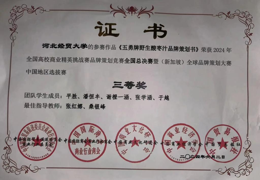 6月2日,由全球华人营销联盟(GCMF)、中国国际贸易促进委员会商业行业委员会、中国国际商会商业行业商会、中国商业文化研究会、中国商业经济学会和中国贸易报社共同主办,新加坡营销协会、(香港)营销师公会、台湾行销科学学会、(台湾)中华国际经贸研究学会协办,中国国际贸易促进委员会商业行业委员会承办的2024年全国高校商业精英挑战赛品牌策划竞赛全国总决赛暨(新加坡)全球品牌策划大赛中国地区选拔赛顺利举行。经过两天激烈的角逐,公司两支参赛团队在桑银峰和贾晶晶两位老师的指导下从600余所高等院校的7000余支参赛队伍中脱颖而出。其中,“雪梨庄园品牌策划工作室”(陈浩、陶昊宇、冯月颖、胡思彤、李紫浩)团队获得全国总决赛一等奖;“五勇品牌策划工作室”(平胜、潘恒丰、谢橙一涵、张学涵、于越)团队获得全国总决赛三等奖。