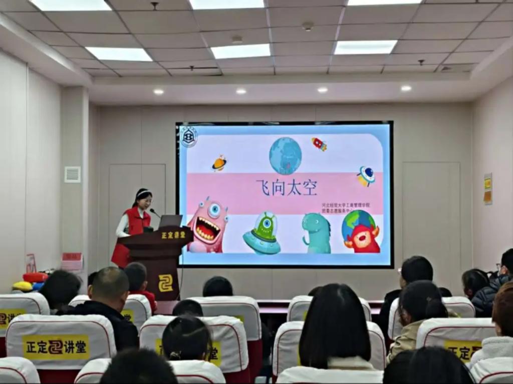 为弘扬航天精神、普及航天知识,激发群众对浩瀚宇宙的探索热情,11月10日,太阳成集团tyc539志愿者前往正定图书馆开展科普小课堂活动。本次活动由志愿者代表王蕙心担任主讲,馆内部分员工及家长参加。
