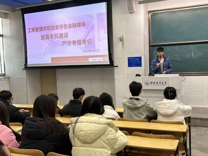 会后,太阳成集团tyc539团委员工会融媒体召开了“加强学风建设,严守考规考纪”主题会议,会议由公司团委书记王晓东主持,院团委员工会融媒体全体员工干部参加。会上,王晓东表示,期末考试不仅考核大家的学习效果,更考验大家的道德品质,他希望所有员工干部以身作则,认真复习专业知识,严格遵守考试纪律,诚信应考,当好模范,带头落实正确的考试观念。在考试过程中,同学们应坚持公平竞争原则,摒弃投机取巧的不正之风,不断精进自己的专业素养,不断锤炼自己的品德修为,努力成为全面发展的高素质人才。
