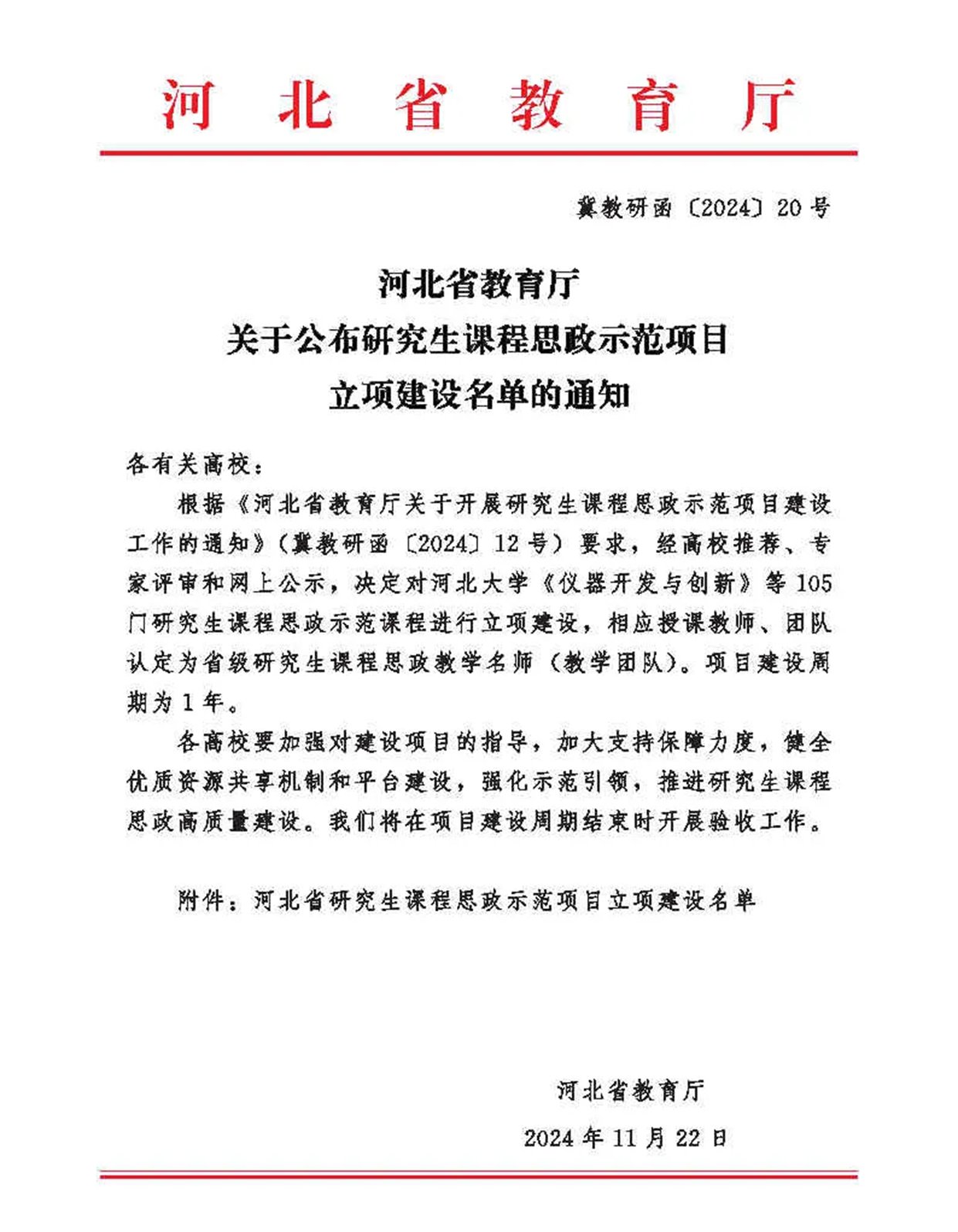 近日,河北省教育厅公布了2024年省级研究生课程思政示范项目立项建设名单。