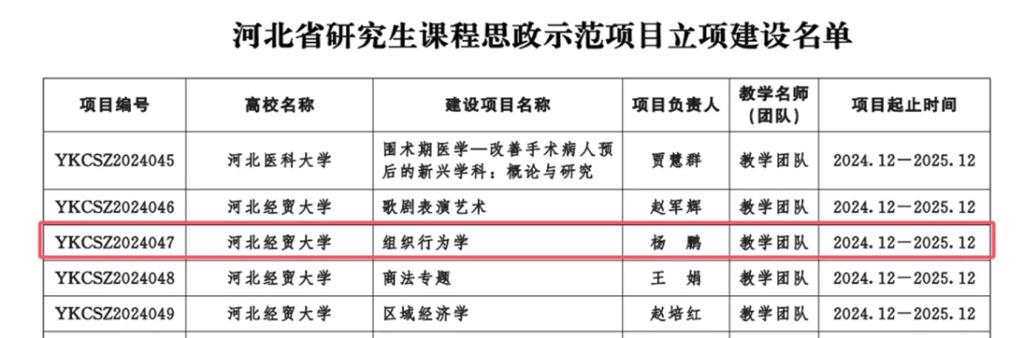 公司MBA课程《组织行为学》(负责人:杨鹏)获得2024年省级研究生课程思政示范项目立项,《组织行为学》课程教学团队(杨鹏、赵娜、张静、卢苓霞、史淑秀、王丽媛、刘培琪)荣获省级研究生课程思政教学团队。