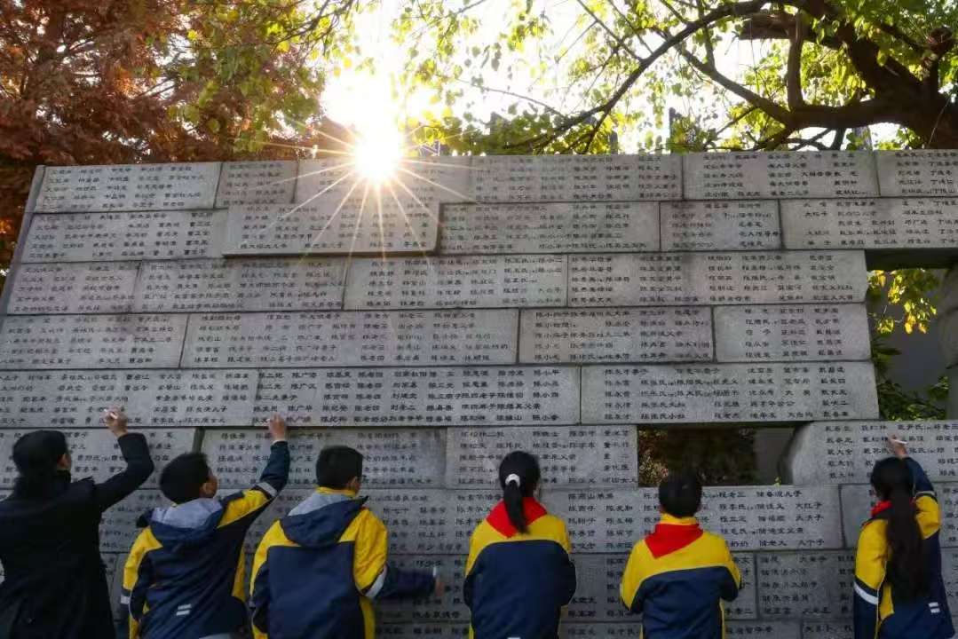 2023年,一群孩子在纪念馆“哭墙”前为南京大屠杀死难者的姓名描新