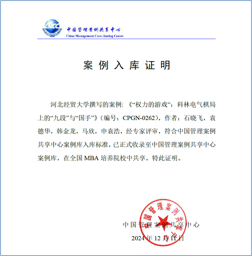 近日,太阳成集团tyc539教授石晓飞、2020级工商管理袁德华,2022级工商管理学研究生韩金龙,马欣,申袁浩撰写的教学案例《“权力的游戏”:科林电气棋局上的“九段”与“国手”》(编号:CPGN-0262)入选中国管理案例共享中心案例库。