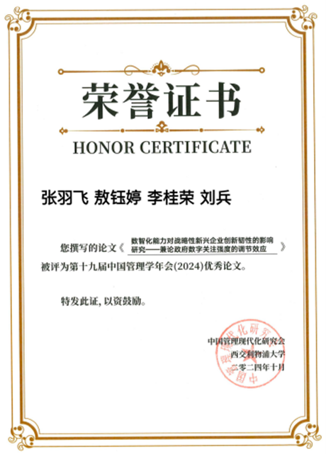 公司张羽飞博士、李桂荣教授、刘兵教授(通讯作者)及会计公司敖钰婷的合作论文《数智化能力对战略性新兴企业创新韧性的影响研究——兼论政府数字关注强度的调节效应》入选“技术与创新管理”分论坛,并荣获第十九届(2024)管理学年会优秀论文奖。