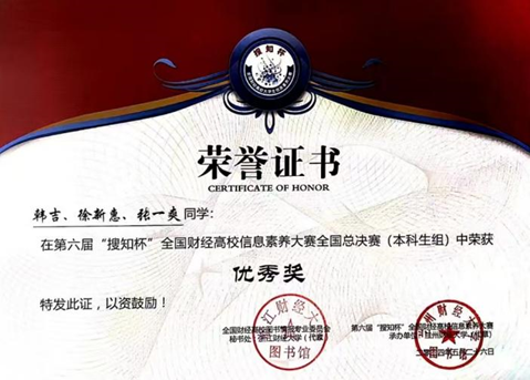 工商学子在全国财经高校老员工信息素养大赛全国总决赛中获奖,2023级市场营销2班韩吉同学所在团队表现突出,荣获本科生代表队优秀奖。