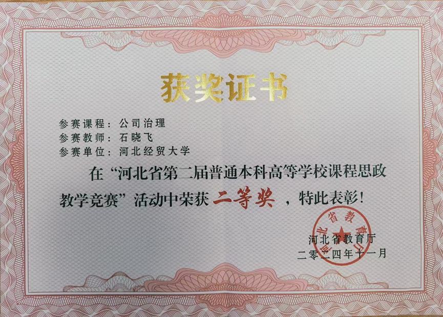 公司石晓飞教授《公司治理》荣获河北省第二届普通本科高等学校课程思政教学竞赛二等奖。