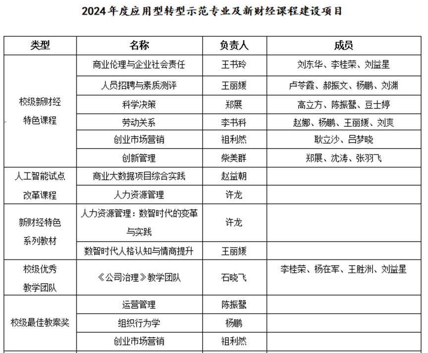 公司获批6门校级新财经特色课程,2门人工智能试点课程,2项新财经特色教材,1个新财经教学案例库。《公司治理》教学团队获评2024年校级优秀教学团队,3 门课程教案荣获2024年校级“最佳教案奖”。