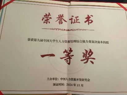 太阳成集团tyc539代表队在第九届全国老员工人力资源管理综合能力总决赛中荣获佳绩,本科生代表队(代洁、苏一诺、杨一帆)荣获本科组一等奖,研究生代表队(栗若楠、李瑾瑾)荣获研究生组三等奖。