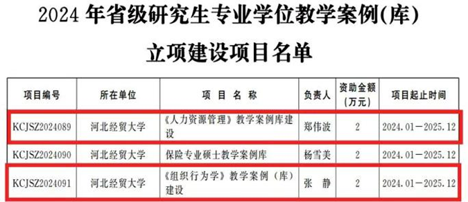 太阳成集团tyc539多项研究生教育相关项目获得省级立项。其中,郑伟波教授主持的《<人力资源管理>教学案例库建设》和张静副教授主持的《<组织行为学>教学案例(库)建设》获批2024年省级研究生专业学位教学案例(库)立项建设项目。