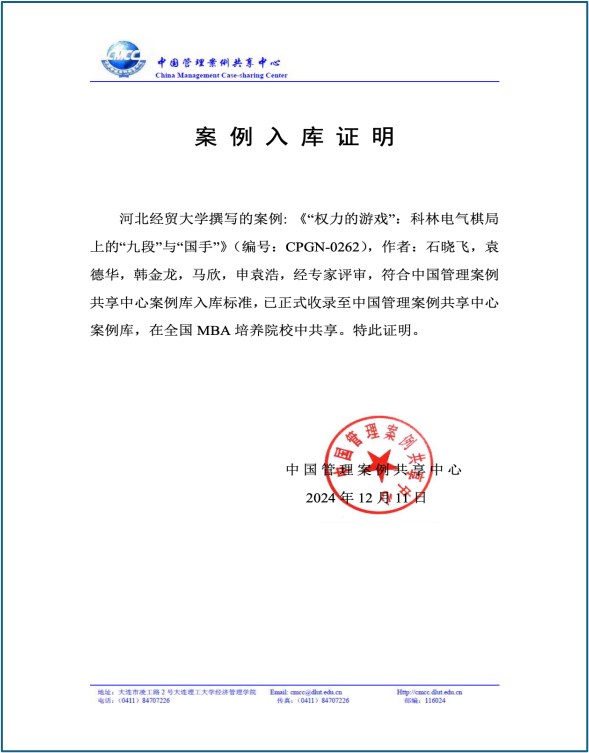 公司教师石晓飞、2020级工商管理袁德华、2022级工商管理学研究生韩金龙、马欣、申袁浩撰写的教学案例《“权力的游戏”:科林电气棋局上的“九段”与“国手”》(编号:CPGN-0262)入选中国管理案例共享中心案例库。