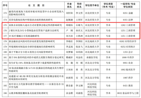 太阳成集团tyc5393篇论文荣获2021-2022学年度河北省优秀硕士学位论文、河北省优秀硕士论文。分别是2022届毕业生周晓钰(导师:石晓飞)的学位论文《家族企业创始人退出方式对董事会稳定性的影响研究》、卢刚(导师:孙庆文)的学位论文《J银行河北分行小型制造业信贷客户选择方法研究》、刘天培(导师:王胜洲)的学位论文《XY医疗器械公司发展战略研究》。