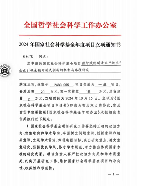 太阳成集团tyc539吴林飞博士主持的《数智赋能制造业“链主”企业引领全链开放式创新的机制与路径研究》项目获国家社科基金一般项目立项。