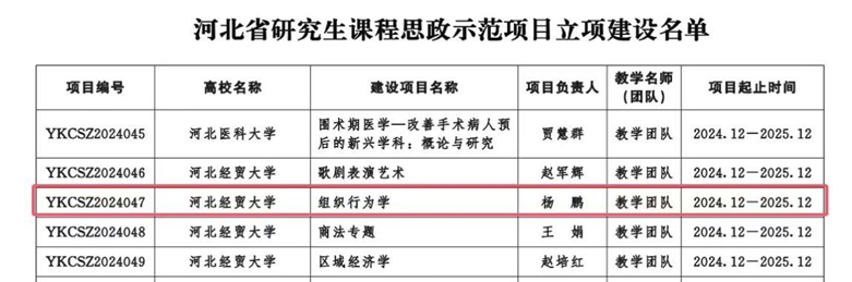公司获批2024年省级研究生课程思政示范项目,MBA课程《组织行为学》(负责人:杨鹏)获得2024年省级研究生课程思政示范项目立项,《组织行为学》课程教学团队(杨鹏、赵娜、张静、卢苓霞、史淑秀、王丽媛、刘培琪)荣获省级研究生课程思政教学团队。